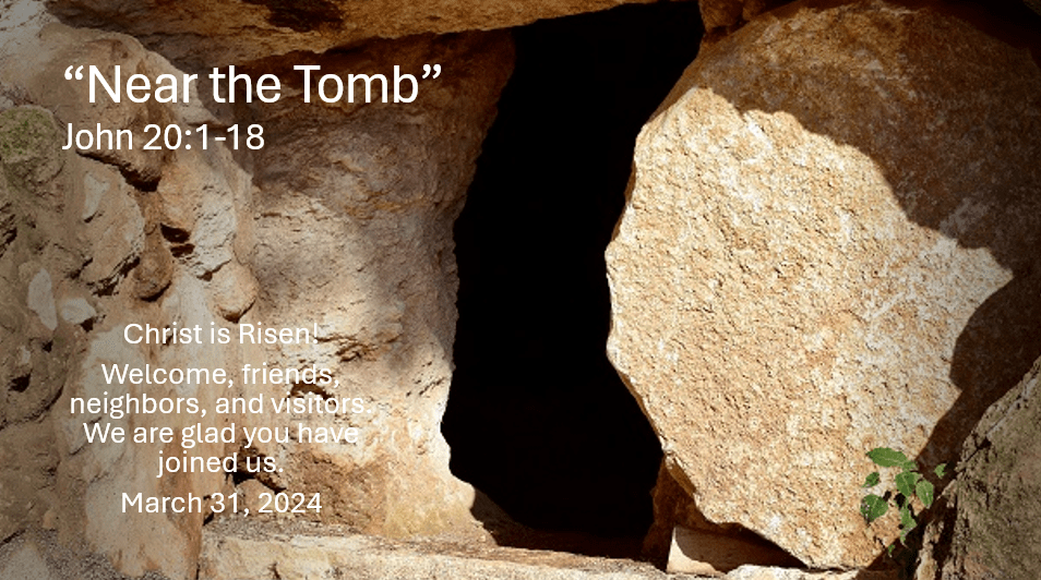 But Mary stood weeping outside the tomb. As she wept, she bent over to look into the tomb; and she saw two angels in white, sitting where the body of Jesus had been lying, one at the head and the other at the feet. They said to her, “Woman, why are you weeping?” She said to them, “They have taken away my Lord, and I do not know where they have laid him.” When she had said this, she turned around and saw Jesus standing there, but she did not know that it was Jesus. Jesus said to her, “Woman, why are you weeping? Whom are you looking for?” Supposing him to be the gardener, she said to him, “Sir, if you have carried him away, tell me where you have laid him, and I will take him away.” Jesus said to her, “Mary!” She turned and said to him in Hebrew, “Rabbouni!” (which means Teacher). Jesus said to her, “Do not hold on to me, because I have not yet ascended to the Father. But go to my brothers and say to them, ‘I am ascending to my Father and your Father, to my God and your God.’” Mary Magdalene went and announced to the disciples, “I have seen the Lord”; and she told them that he had said these things to her.